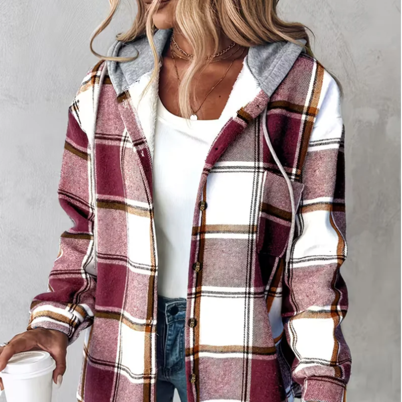 - Yksityiskohdat: Huppu, napit edessä, ruutukuosi