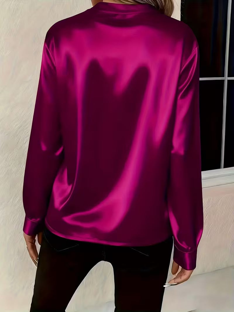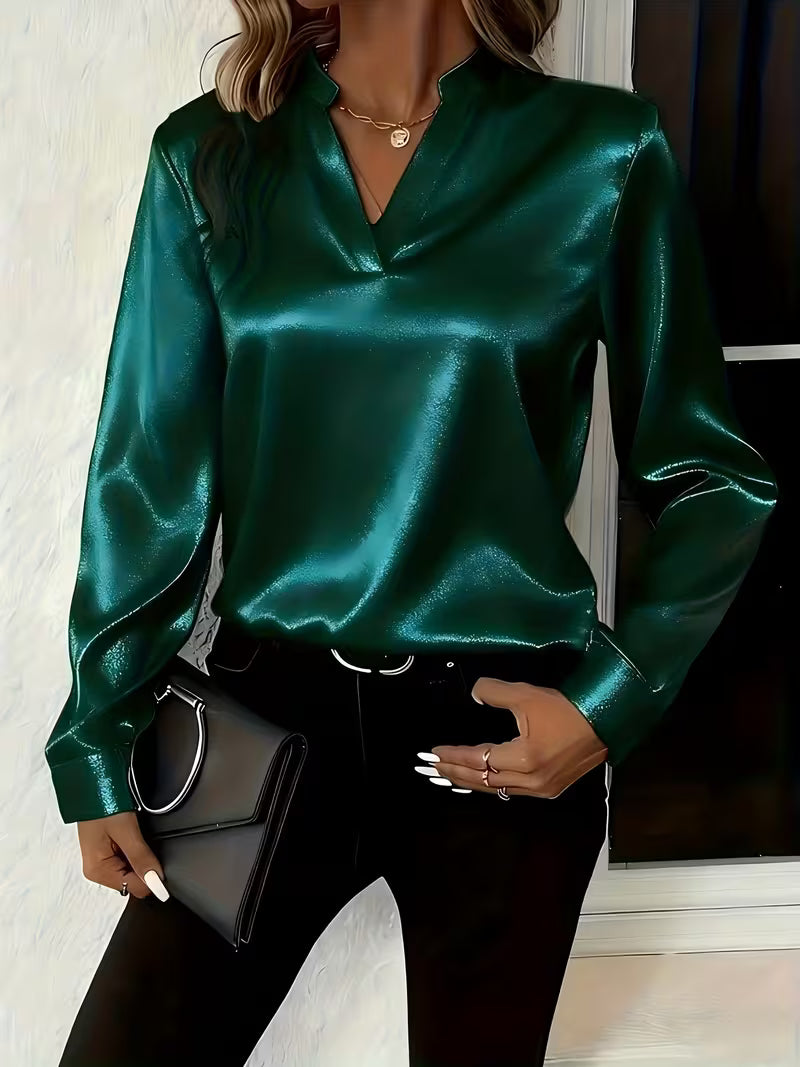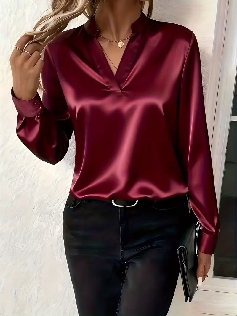 Tämä satiininen pusero tuo asuusi välittömästi ylellistä ilmettä. Pehmeästi laskeutuva kangas ja kaunis V-pääntie tekevät puserosta ajattoman valinnan niin arkeen kuin juhlavampiin hetkiin.